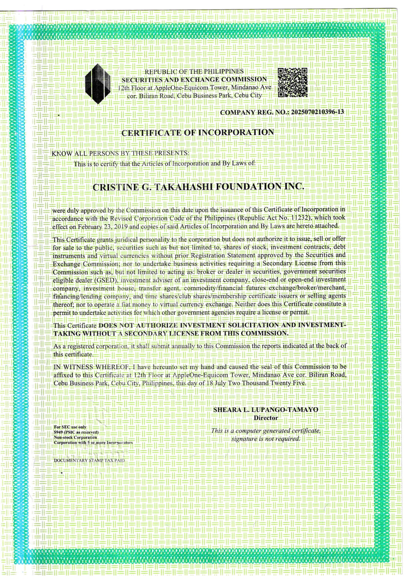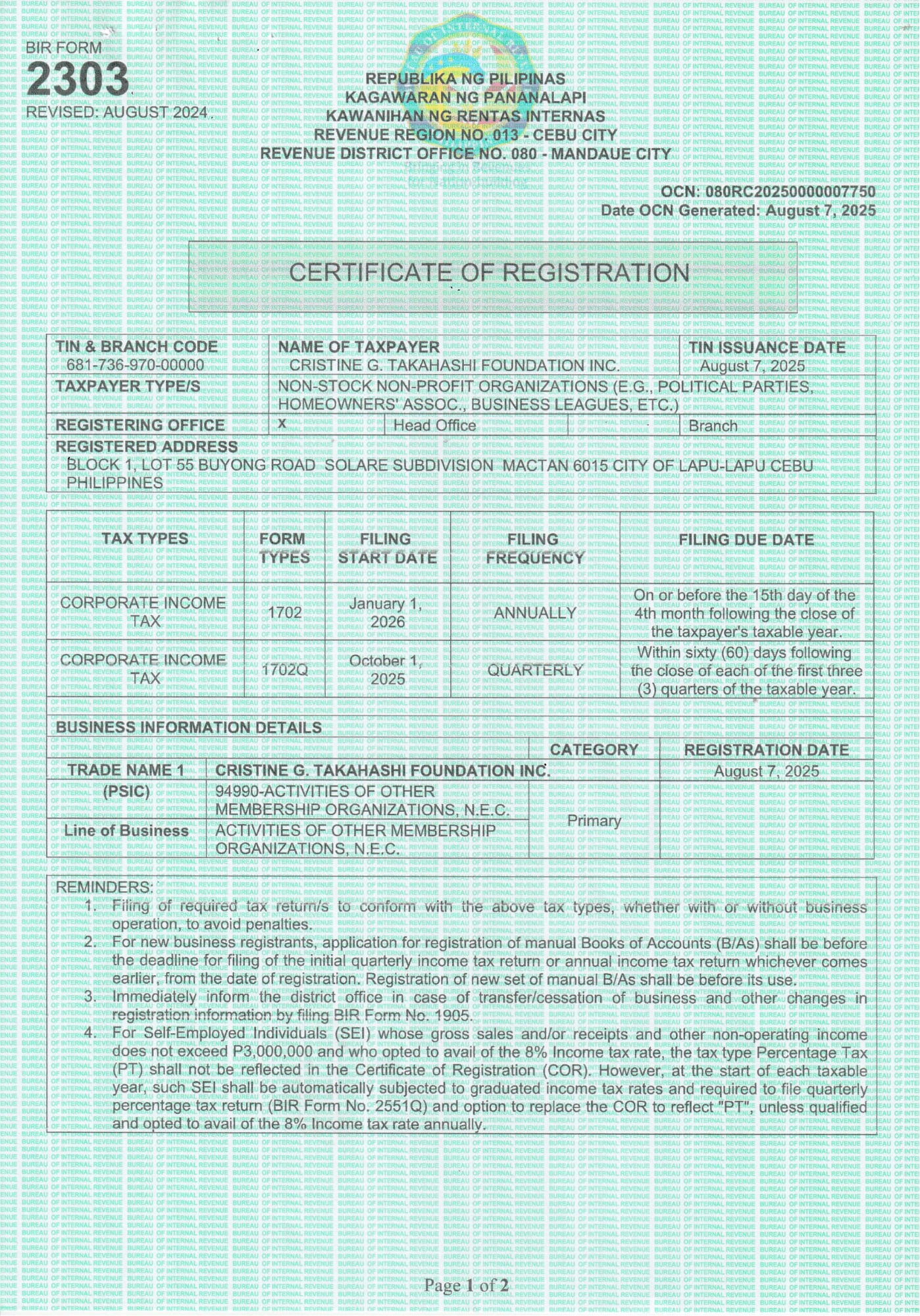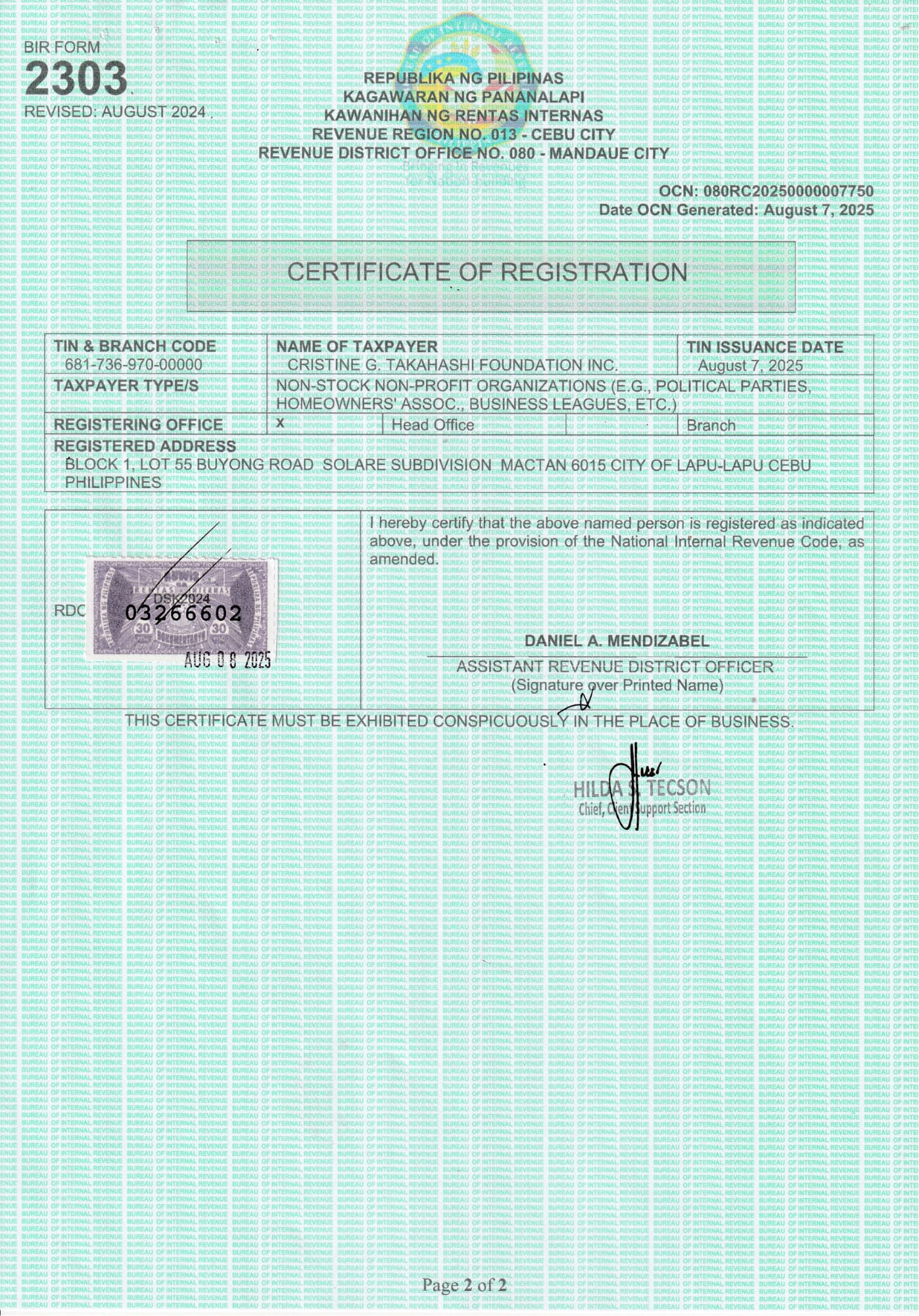 Founded by philanthropist Ms. Cristine G. Takahashi, the organization is grounded in more than thirteen (13) years of unwavering service to the underserved—service shaped not by convenience, but by deep conviction.